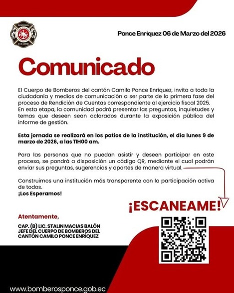 El Cuerpo de Bomberos del Cantón Camilo Ponce Enríquez pone en conocimiento, que se encuentra abierta la convocatoria al proceso de ascenso al grado de Bombero 1, en estricto cumplimiento de la normativa vigente y los procedimientos internos establecidos.